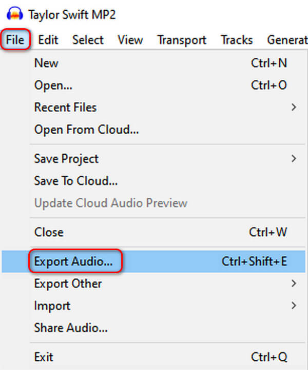 Step 4At the top of the program, click the dropdown menu labeled File, and in the list that appears, select Export Audio.