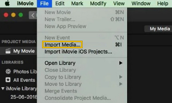 Step 1On your Mac, locate the iMovie to launch. Now, open a project by clicking the File tab menu and choosing the Import Media option. Locate the music file you want to import from your music library or directly from your iTunes library.