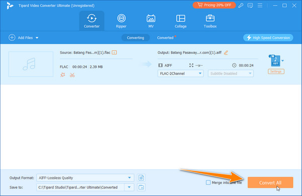 Tipard Video Converter Ultimate is the epitome of all multimedia converters, and it offers you a way to convert FLAC to AIFF. You can download this converter on your Windows and Mac for free and work without an internet connection. Aside from the format mentioned, it also supports over 500+ audio and video formats with different settings you can select, which means conversion here is unlimited. As it surpasses the speed of other converters, this is the best choice to have an immediate result without depreciating the overall quality of the output. Learn how to use this using the tutorial we have below.