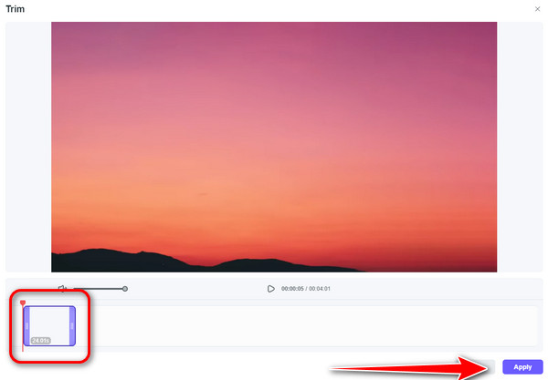 Step 3Click the Trim function and highlight the audio part you want to delete. Afterward, click the Apply button to trim the file. Once done, click Export to complete the final saving process.