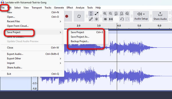Step 4To save the cropped MP3, go to the File section. Then, select the Save Project option. Once done, you can try playing your audio on your MP3 player.