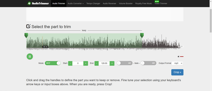 Step 2Once the file is loaded, adjust the interactive timeline sliders to mark the section's start and end points you wish to keep. Take your time to ensure accuracy.