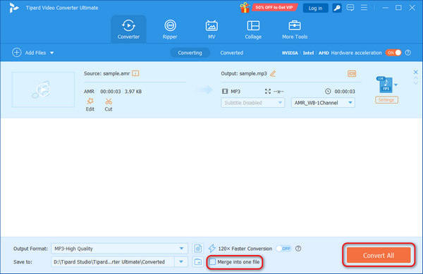 Step 3 It is time to convert the M3U to MP3 files. If there are multiple files, it is recommended that you click the Merge into one file button at the bottom right. Once you are satisfied with the formats, click the Convert All button to convert M3U to MP3.