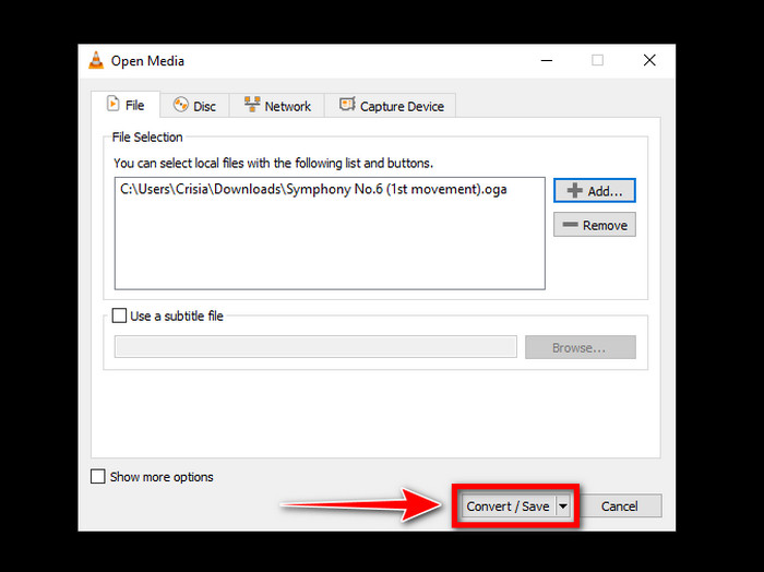 Step 1Go to media at the top of VLC's interface and select the Convert/Save option. Then, click the Add button to import your OGA file.