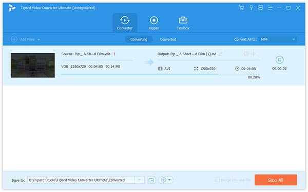 After you have set output format and destination, and edited video effects (if needed), click the big "Convert All" button to start converting MTS file to AVI.