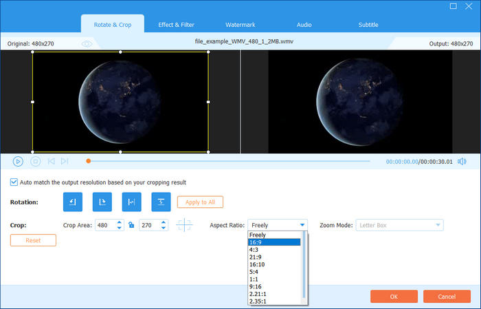 Step 3 Below the Rotate option is the Crop option. There are several types in Aspect Ratio, like 16:9, 4:3, 1:1 and 9:16. It can help you quickly get the size you want.