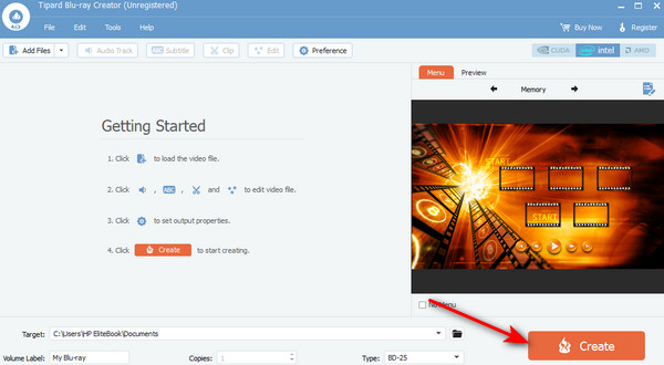 After editing your 4K Blu-ray audio bitrate, you can start saving. Just click on the Create button. Your output file will be saved in the Target folder.