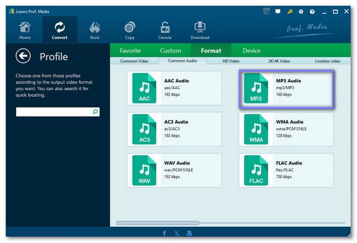 Step 2 After loading your Blu-ray, click Output Profile and Change to open the format options. From the list, navigate to Format and Common Audio, and here you will find different audio formats, including MP3, AAC, and WAV. Choose MP3 as your preferred format of the output file.