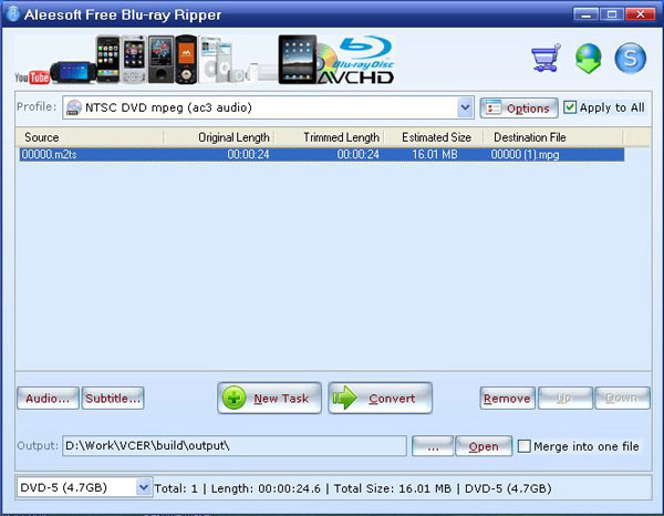 As another free Bluray to DVD converter, Aleesoft Free Bluray Ripper is a totally clean and free program to burn Bluray to DVD, SVCD, VCD, AVCHD DVD, Bluray disc (BD), support audio track and subtitle editing.