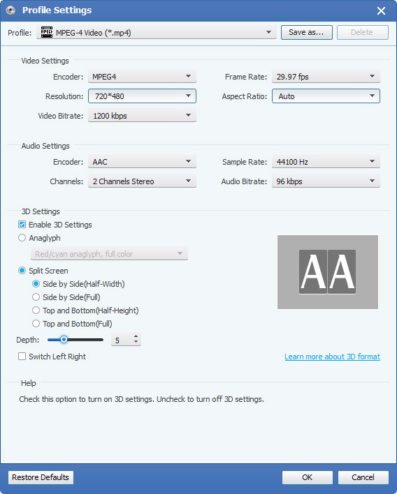 Detailed video and audio settings are provided by this DVD Ripper for you to adjust, such as video Encoder, Frame Rate, Resolution, Bitrate and audio Encoder, Channels, Bitrate, Sample Rate, etc. Even more, you can input your own parameters. The well-customized profile can be saved as "User-Defined" for your later use.