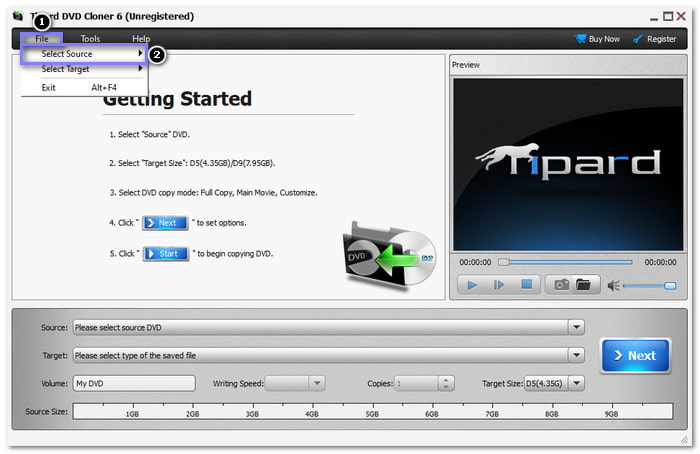 Step 2 Insert the DVD9 or DVD5 disc into your DVD drive. Head to the File menu, choose Select Source, then import the source DVD.