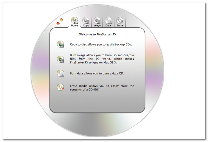 Stands out for its graphical interface; FirestarterFX organizes its features into five tabs. These are home, copy, image, data, and erase. These tabs help the users perform certain tasks like burning data CDs and DVDs, copying discs at high speed or erasing rewritable discs. The Image tab lets you quickly burn Cue/Bin and ISO images.