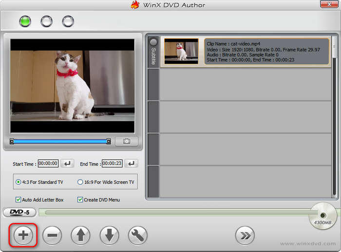 Download WinX DVD Author and then run WinX DVD Author and choose Video DVD Author on the top right side. Click the Add button to add videos and audio files to WinX DVD Author. You can also click the Subtitle button on the left side of your videos to add subtitles. Then, click the Next button to go on.