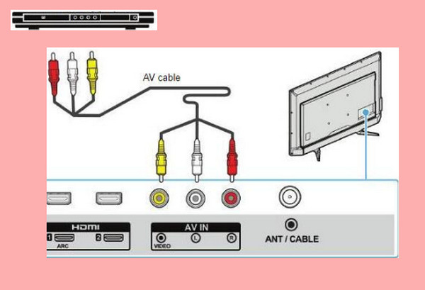 Step 3On the Home Screen of your TV, select the AV tile. Then, you can insert the disc into your DVD player, then you can now watch it. That’s how to connect a DVD player to the TV with a red, white, and yellow connector. If you have an old TV with a DVD player, you don't need RCA or AV cables.