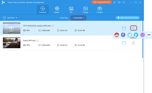 Step 4After that, you can share the video on your Twitter. To do so, go to the Converted menu, click the Share button, and choose the Twitter option.