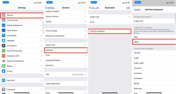 Step 1Install Giphy on your device. Go to the Settings app, tap General, and then Keyboard. Tap Add New Keyboard and select GIPHY.