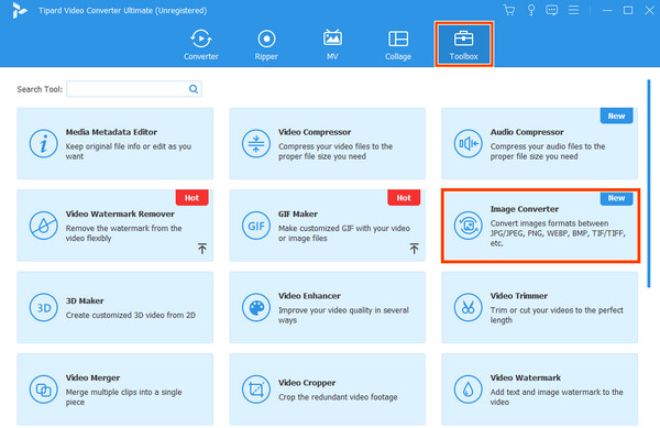 Step 1Grab the HEIC photos and prepare for the conversion. On the program’s interface, go to the Toolbox and click the Image Converter tool. Then, on the next window, upload the HEIC files by clicking the Plus button.