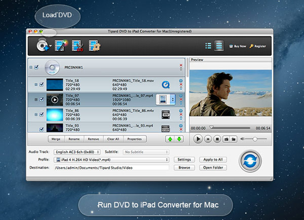 If you'd like to enjoy DVD videos on iPad, you have come to the right place. Tipard Mac iPad Converter is your first choice to convert any DVD to iPad compatible video format like MP4, MOV, H.264, M4V, etc with ease. Also, it allows you to take out the audio files from DVD movies and convert them to MP3, AAC, AIFF, M4A, etc with 100% original quality. In a short while, you're free to enjoy the converted files on diverse media players like iPhone 17/iPhone Air/iPhone 17 Pro/iPhone 17 Pro Max, iPhone 16/iPhone 16 Plus/iPhone 16 Pro/iPhone 16 Pro Max, iPhone 15/iPhone 15 Plus/iPhone 15 Pro/iPhone 15 Pro Max, iPhone 14/iPhone 14 Plus/iPhone 14 Pro/iPhone 14 Pro Max, iPhone 13/iPhone 13 Pro/iPhone 13 Pro Max/iPhone 13 mini, iPhone 12/12 Pro/12 Pro Max/12 mini, iPhone 11/11 Pro/11 Pro Max, iPhone XS/XS Max/XR/X, iPhone 8/8 Plus, iPhone 7/7 Plus, iPhone 6/6 Plus, iPhone 5, iPhone 4S, iPhone 4, iPad Pro, iPad mini, iPad 4, iPod nano, iPad touch and more digital multimedia players. It's regarded as the first-rank DVD to iPad Converter for Mac.