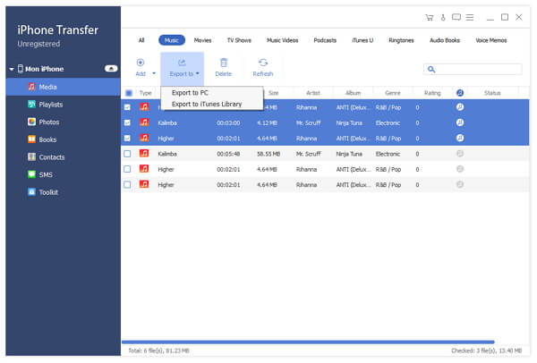 On the left side of the main interface, you will see the display list, which will show your various iPad files in different types. Click "iTunes U" on the display list, then the right side of the interface will display all your iTunes U files in details as the following screenshot shows. In front of each listed iTunes U file, there is a check box, you can check all to choose all iTunes U files or just one to choose, then the "Transfer" button will be activated instanly.