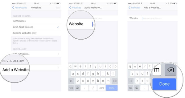 Choose "Websites" below, to click "Allowed Content" and "Limit Adult Content" in order. Select "Add a Website" in the "Never Allow" list. Paste the "URL" of the website need to be blocked, and hit "Done" finally.