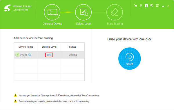 - 2. After iPhone Eraser scan your iPhone, it will ask you to set the erasing level. If you select Low Level, the application will overwrite data once. The higher the level, the more the overwrite times.