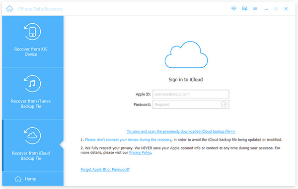 - 1. Open Tipard iOS Data Recovery and select Recover from iCloud Backup File tab on the top.