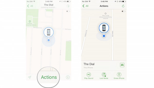 Step 4: There is an Actions at the bottom of your interface. Tap it and here are three options you can choose just like the three options you enable Find My iPhone on web via iCloud.com.