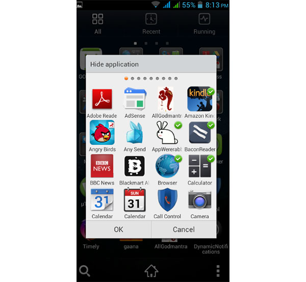 Tap "Hide App" option the middle of the list first. Then all your Android applications will display in window named Hide application. Tick multiple Android apps and press "OK" to check.