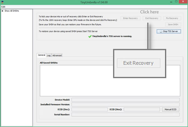 After Tiny Umbrella detects your iDevice, choose Exit Recovery button.