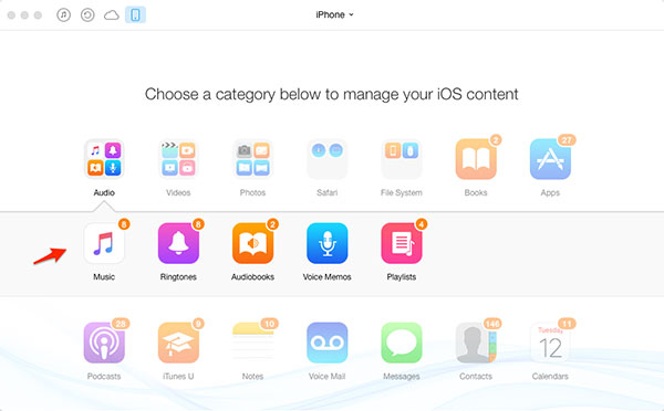 Open Tipard iPhone Transfer Ultimate, you can click on Media button on the left. Then click on Music button on the top and choose the music files you want to transfer.