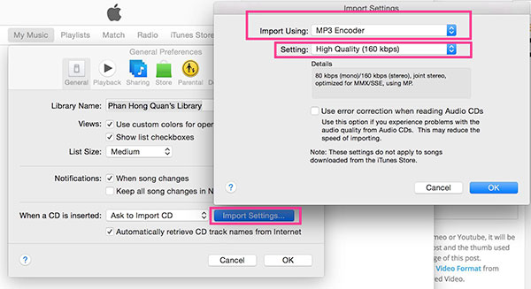 Go iTunes preferences > General, click 'Import Settings' button at the bottom to open the window. Choose MP3 Encoder at "Import Using" and MP3 quality at "Setting". Then click "OK" button to save the changes.