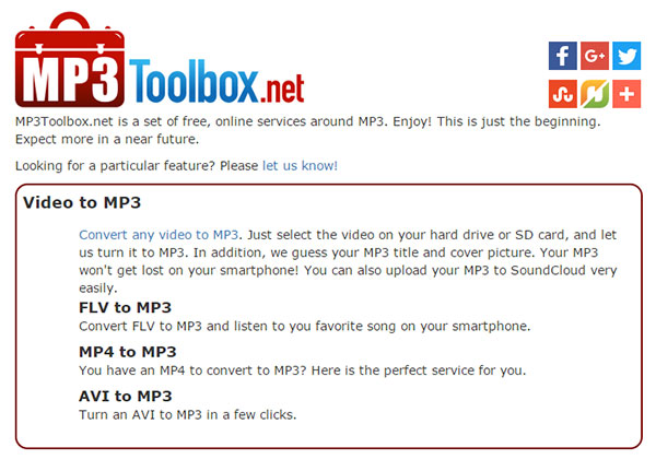 MP3 Toolbox is a set of free, online services around MP3. It has the ability to convert MP4 to MP3. Just select the video on your disc, and turn it to MP3. Then you can upload MP3 to SoundCloud very easily. Besides, it enables you to convert MP3 to MP4. Choose an MP3 in your personal library and start the MP3 conversion. Want more? You can easily share your converted video on Facebook and YouTube.
