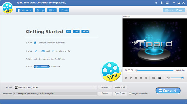 Tipard MP4 Video Converter is an all-in-one video conveter to convert video files to MP4. So you can convert videos to MP4, convert MPEG to MP4, convert AVI, etc to MP4 which is compatible with almost all popular portable players, including iPod, iPod Touch, iPod Nano, iPhone, iPhone 3G, iPhone 4, iPad, iPad 2, PSP, Apple TV, Creative Zen, etc. The following statement is the step by step guide on how to convert video files to MP4 with Tipard MP4 Video Converter.