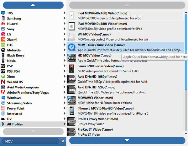 If you want to watch CanonXF-300 MXF files on Quick Time, you need to select MOV output format by clicking Profile drop-down arrow to select MOV-QuickTime Video (*.mov) format as the output video format.
