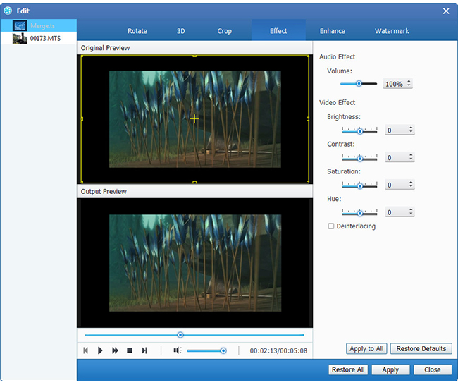 With the professional editing functions, you can drag the slider bar or enter the value to set the Brightness, Contrast, Saturation and Hue. Plus, you can also click the up or down arrow to set them. After finishing settings, click OK to finish. Note: You are allowed to convert them to 3D videos and edit 3D features as you like.