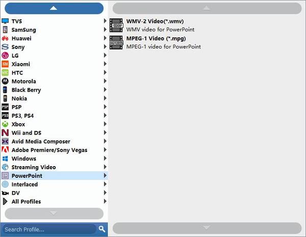 Then you need to select PowerPoint compatible format. Click "Profile" drop-down button to open the "Profile" list. Plus, you can directly input the output format in the query window.