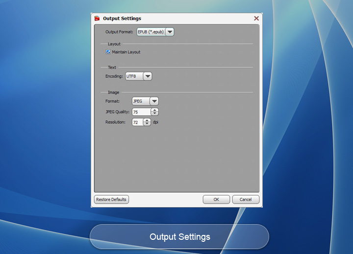 In the aspect of converting PDF to ePub, the biggest spotlight of this PDF ePub Converter is its adoption of OCR, which enables users to set occording to individual requirement from these points: Speed, Balance or Accuracy. When accuracy mode is selected, the converted ePub files will be kept intact as the original PDF file. As the OCR tech rnables the software to recognize textual and non-textual components in a high degree, it is redundant to worry about the layout when converting PDF files (text mixed with images). Besides, if you want to make a slight change of the mixed image layout, it is also available. What you need to do is to adjust the image layout in ePub profile settings. You can also set the text encoding, image format, resolution and JPEG quality.