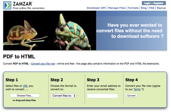 Zamzar has been changing file formats over 10 years since 2006. And its rigorous interface and high quality output file quality has gained loyal users. With two detailed PDF and HTML introduce tables below, you can acquire their technical details, associated programs and other useful information. As for how to use the PDF to HTML converter open source, just import PDF files, choose HTML as output format and fill in your email address. After few seconds, you can receive the mail, with your converted HTML page contained. There is no need to worry about whether it is safe to convert documents, as Zamzar promise to keep all your personal files in safe mode.
