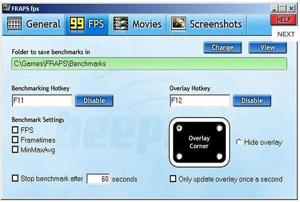 2. Gamers could use hot keys to control Fraps when capturing games. Besides recording and pause, it provides plentiful hotkey options, like Benchmarking, Overlay and more.