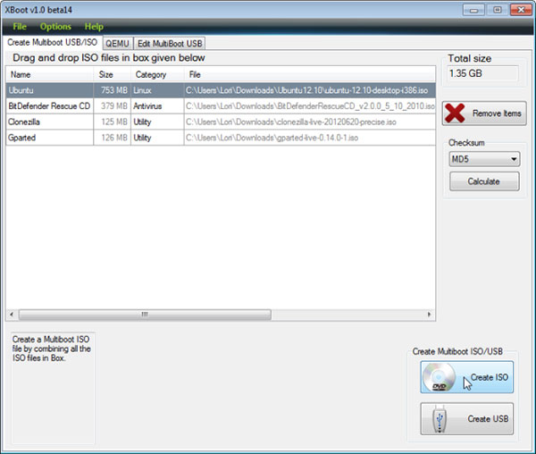 XBoot is another utility that has the ability to create multi-boot USB flash drives. XBoot is able to extract ISO image from files and burn ISO to USB drive for installation. The workflow to create a bootable USB with XBoot is simple. Once you drag and drop the ISO file onto the utility window and click Create USB, XBoot will do all work automatically. Besides bootable USB maker, XBoot also could make rescue disc with multiple operating systems.