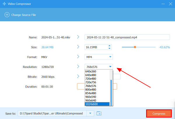 Step 4If the chosen format supports resolution adjustment, you can select your preferred resolution by clicking the Resolution menu. The Bitrate and Duration will adjust automatically based on your set compression percentage. Preview the compressed video by clicking the Preview button. Once satisfied, choose your preferred folder path using the Save To option. Finally, click Compress to complete the process.