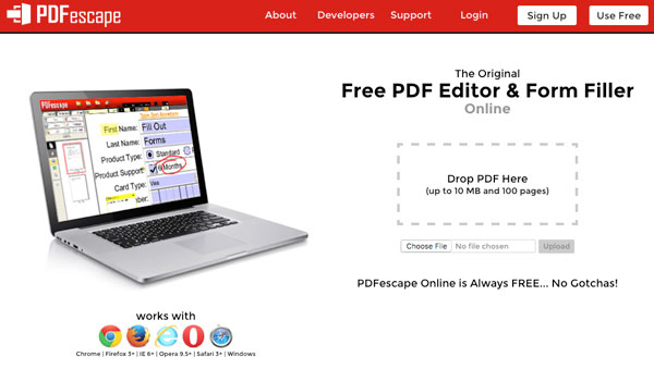 If you are looking for free editing PDF files online, PDFescape is a favorite web PDF editor accessible through browsers. The PDF editor is compatible with Safari, Chrome, Internet Explorer, Firefox, and Opera Web browsers. Just click the features in the interface of PDFescape to edit PDF files, annotate PDF documents, create new PDF forms, fill out PDF forms, view PDF files and password protect PDF files with digitally sign documents where you may be. It is a multi-faceted web PDF editor without taking up precious memory of your Windows or Mac operation system.