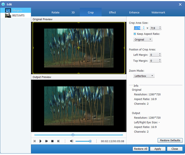 With Effect, Trim, Crop and Watermark four video editing functions, you can easily edit any TS file to create personalized video.