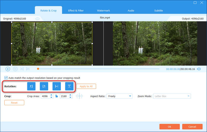 On the left video window, you can drag the controllers to crop your video. You can also go to the Rotate section to manually input your desired resolution to crop your video. To get a standard video aspect ratio, you can also click the Aspect Ratio dropdown button to select a desired aspect ratio, such as 16:9, 4:3, 21:9, and 16:10.
