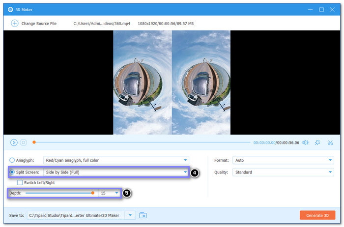 Step 5 After making all the adjustments, check the preview to see if you are happy with the result. If everything looks good, click the Generate 3D button to export your video. Please wait for the process to finish, and your 360 split-screen VR video will be ready to watch.