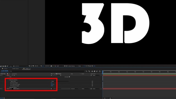 Step 2Next, on the 3D layer box, you will see two options, The Geometry Options and the Material Options. Open the Geometry Options and then adjust the Extrude Path. The Extrude Path will help you achieve the thickness that you desire. Set it to 200.
