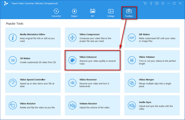 Step 1 Install and launch the free download of Tipard Video Converter Ultimate. After that, click the Toolbox section. Then click the Video Enhancer setting.
