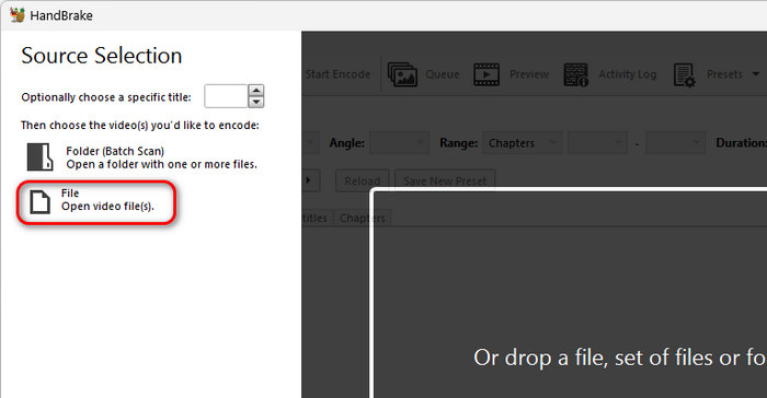 Step 1 Launch HandBrake and click the File button on the left side to import your MP4 video to HandBrake.