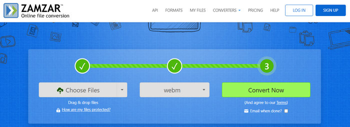 Zamzar is a reliable online conversion tool that supports a large number of file formats, including MP4 to WebM. It also provides an easy solution for quick format changes, supporting direct file uploads and URL imports. However, this MP4 to WebM converter has its drawbacks. For example, it doesn't offer you advanced video profile editing features. You cannot enhance your video or compress its size. But if you only want a quick way to convert MP4 to WebM, then Zamzar is a good choice.