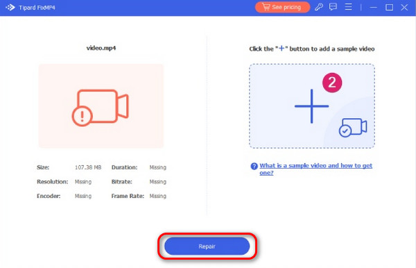 Step 3It is time to add the reference of the software and how it will fix the video you recently imported. Please add the sample video on the right Plus button. The process interval will be the same as in the original video. Later, click the Repair button to start fixing the video as you prefer.